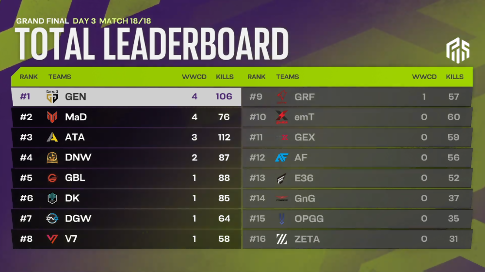PWS: 페이즈 2 그랜드 파이널 최종 순위 상위 8팀이 진출합니다.