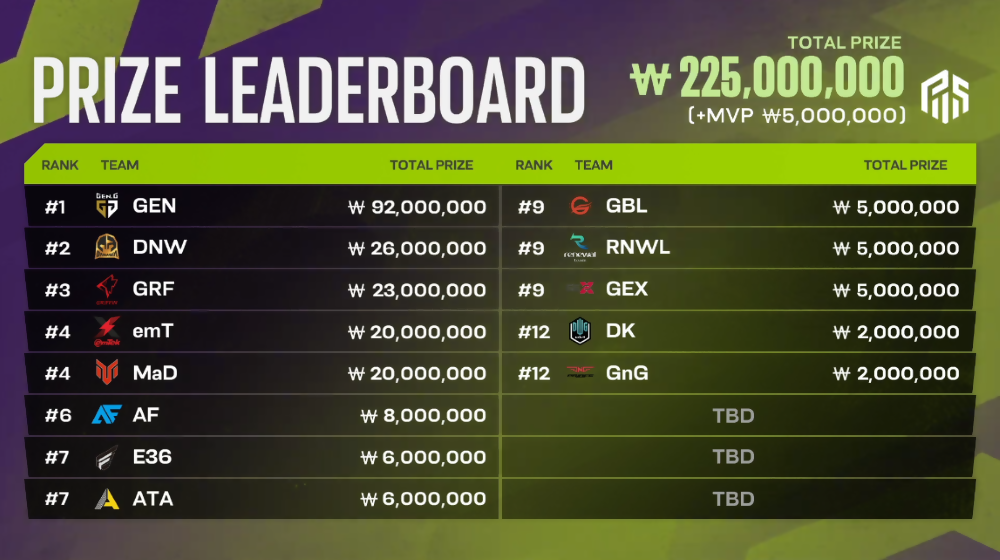 - Gen.G, MaD Clan, ATA, Danawa e-sports, GHIBLI ESPORTS, DWG KIA, DetonatioN Gaming White, Veronica7
