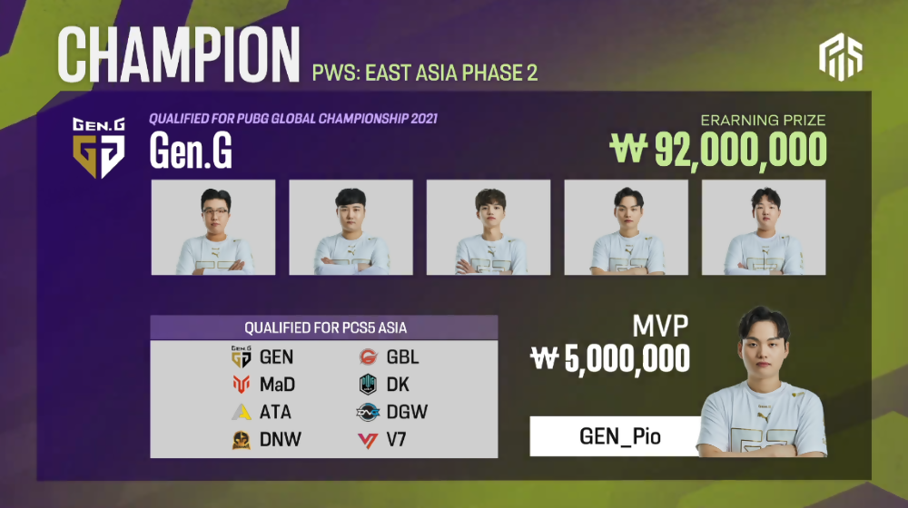 Gen.G가 PWS: 페이즈 2의 최종 우승을 차지하며, PGC 2021의 진출권을 획득했습니다.