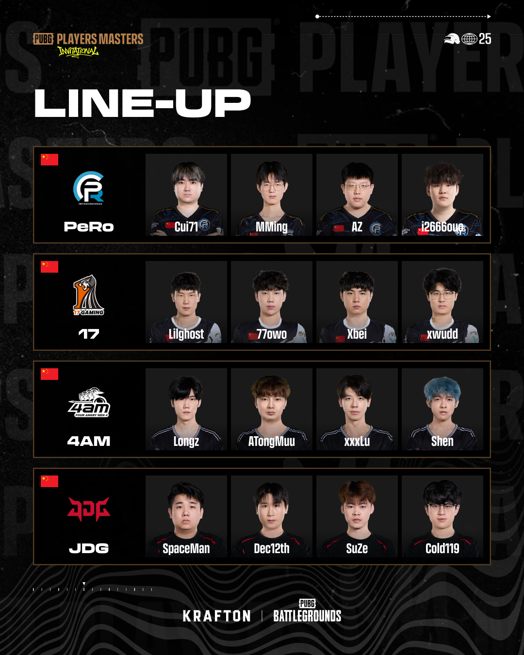 | 로스터 | - Cui71 - MMing - AZ - i26v6 | - Lilghost - 77owo - Xbei - xwudd | - Longz - ATongMuu - xxxLu - Shen | - SpaceMan - Dec12th - SuZe - Cold119 |