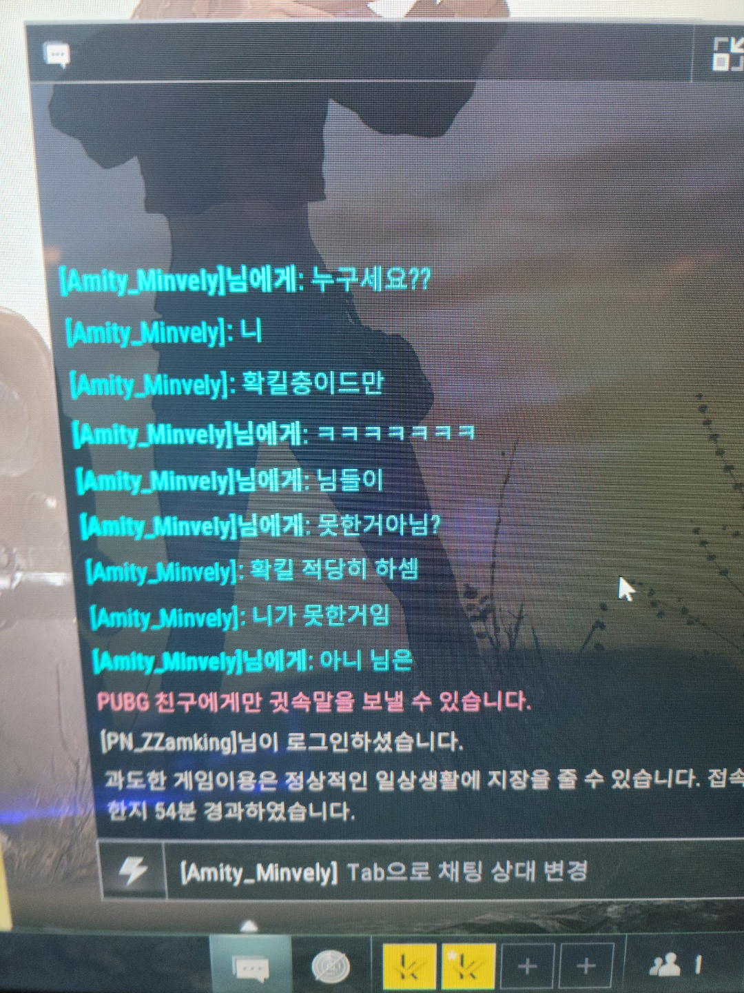 여러분 이분만나면 확킬찍지마세요 경쟁전에서 팀원들 다죽고 한스쿼드랑 싸웠는데 2명확킬 찍었다고 친추까지해서 난리네요ㅎㅎ