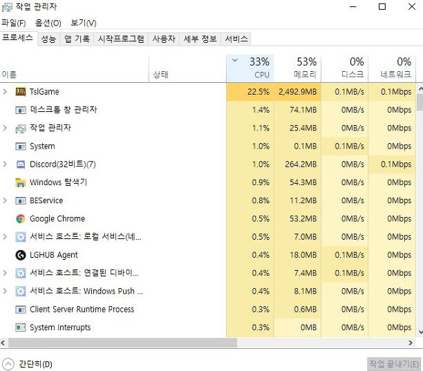 화면이 멈춰서 작업관리자를 통한 강제 종료를 시전 하려 하는데