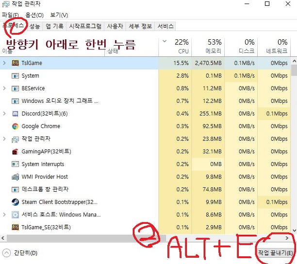 alt+e 를 눌러줍니다 그러고 스페이스바 한번 누르면 배그가 꺼져 있을 거에요.