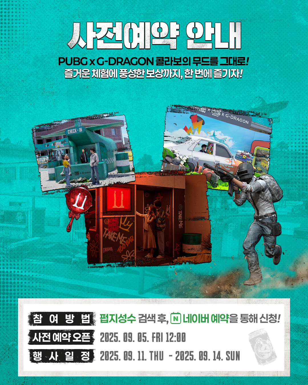 9월 11일(목)부터 14일(일)까지 단 4일, 배틀그라운드 x G-DRAGON 업데이트를 기념하여 펍지 성수에서 팝업스토어가 진행됩니다. (2025년 9월 5일(금) 12:33 수정)