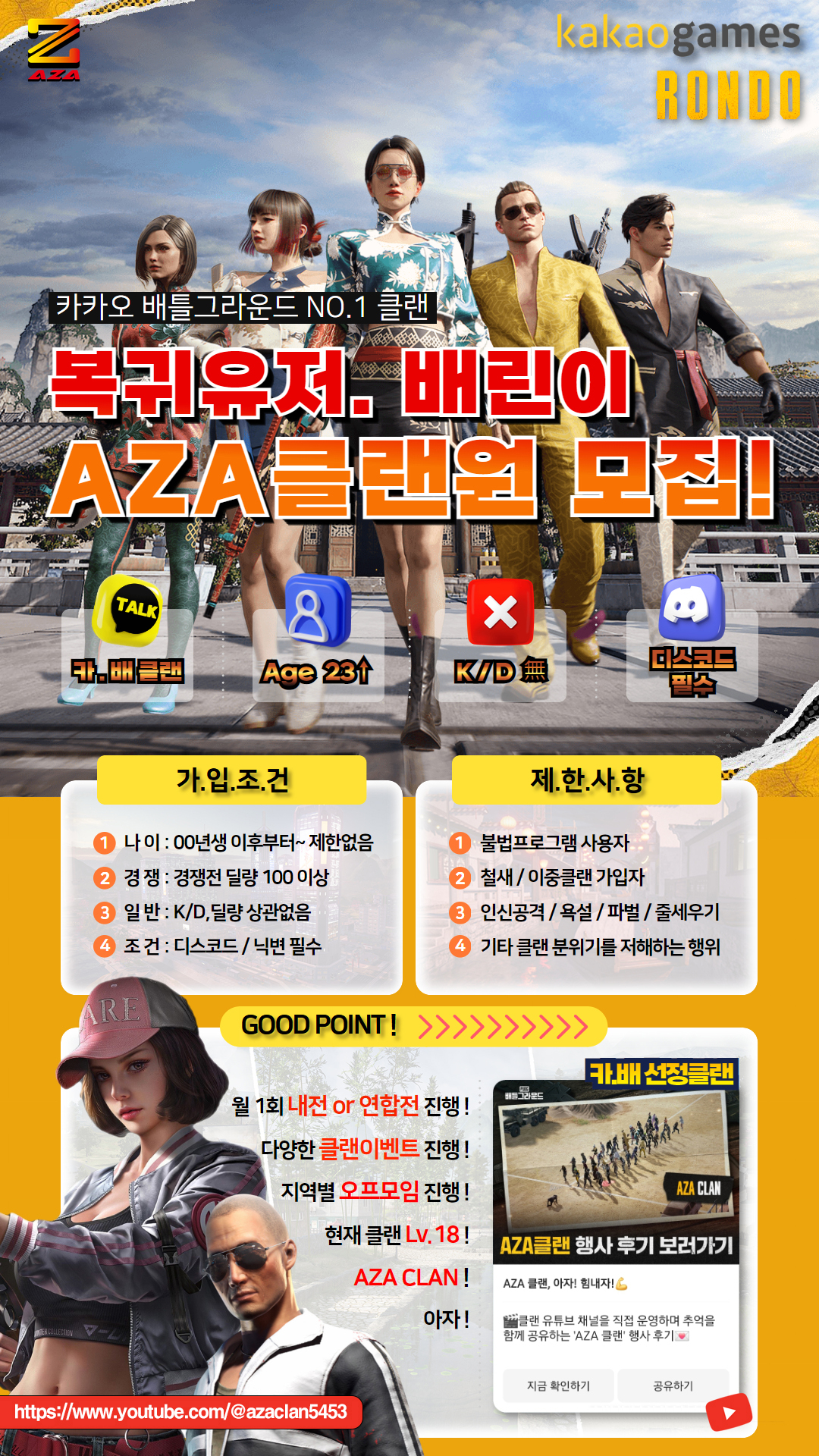 안녕하세요! 카카오배틀그라운드 AZA클랜 입니다. 2021년도에 만들어져 현재 200명정도의 정회원으로 이루어져 있습니다. 실력보다는 인성과 매너만 있으시면 되고, 클랜원끼리 서로 예의만 지켜준다면 정말 재미있고 즐거운 클랜 생활을 하실 수 있습니다. 클랜내전을 통해 다양한 이벤트도 진행중 입니다. 복귀 or 초보자도 언제나 환영합니다. 잘부탁드립니다. AZA클랜 은 언제나 열려있는 마음으로 여러분을 기다립니다. | ||