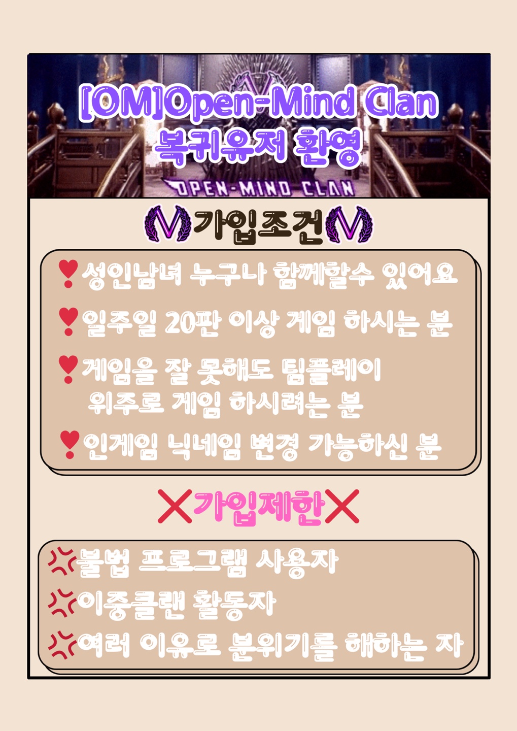 OM클랜은^^ - 현재 70명 이상의 클랜 식구들이 함께 하고 있습니다. - 오픈마인드 클랜명에 걸맞게 클랜원들이 함께 이끌어갑니다. - 경쟁전 위주로 게임하고 있지만 일반게임 유저도 환영 합니다. - 연합 및 교류클랜과 내전을 진행하고 있습니다. - 대형 클랜은 아니지만 앞으로가 더 기대 되는 클랜이 될 것 임을 약속 드립니다. - 라온연합 스크림 참여하고 있습니다. - 교류클랜 문의를 환영합니다. - 디스코드 서버부스트 3레벨 입니다. (오디오 및 방송품질 최상) 이런분들을 지향 합니다~^^ - 성인남녀 누구나 - 접속률 좋으신분!! 테스트 기간 7일 (20판 이상 가능하신 분) - 테스트 합격 후 인게임 닉네임 3일 내로 변경하신분 - 오픈카톡 운영하고 있으며 참가 의사는 자유 입니다 - 딜량 제한 없지만 잘 하시는 분은 인기남,인기녀로 인정 합니다 - 오전반 및 밤샘반 멤버 환영 합니다 - 게임을 잘 못해도 팀플레이 위주로 게임 하려는 의지가 있으신 분 - 매너있고 오픈마인드를 가진 오더수 환영 합니다 - 스크림 고정멤버 상시 모집합니다 자세한 사항은 문의 부탁 드립니다 가입제한 - 불법프로그램 사용자 - 여미새, 남미새, 여왕벌, 철새, 이중클랜 - 비매너, 욕설, 패드립, 남탓, 훈수 등 온갖 충 - 끼리끼리만 하려고 하시는 분 - 인게임 닉네임 변경 불가능한 분 | ||