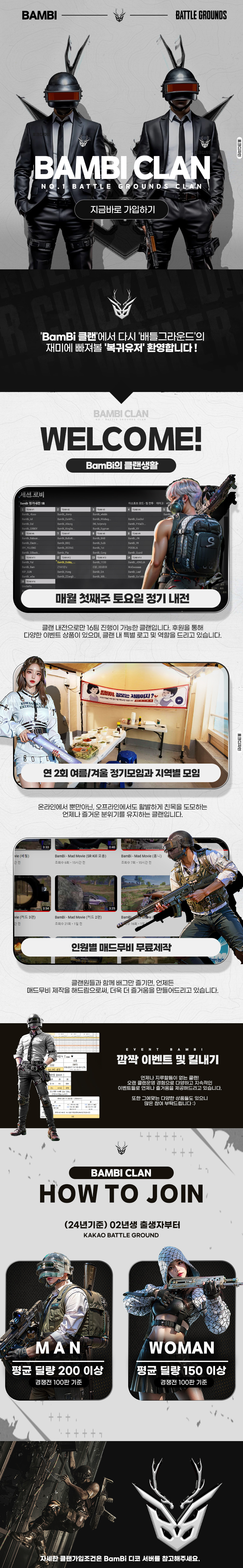 안녕하세요 ! 카카오배그 BamBi (밤비) 클랜입니다. 22년 6월에 만들어져 현재 약 200명이 조금 안되는 인원들로 구성되어 있습니다. (23년 12월기준) 1. (24년도기준) 02년생 출생자 부터 가입가능 2. 경쟁전위주로 아래 홍보이미지 가입조건 참고 3. 정기내전 / 정기모임 / 깜짝이벤트 / 커스텀참여 등 활발한 활동 BamBi 클랜을 진심으로 아끼고 생각하는 마스터와 운영진 그리고 클랜원들이 새로 가입하는 신입, 여러분들을 기다립니다. 저희 밤비클랜에서 오래오래 잘 지내주실 좋은 분들 기다리겠습니다. | ||