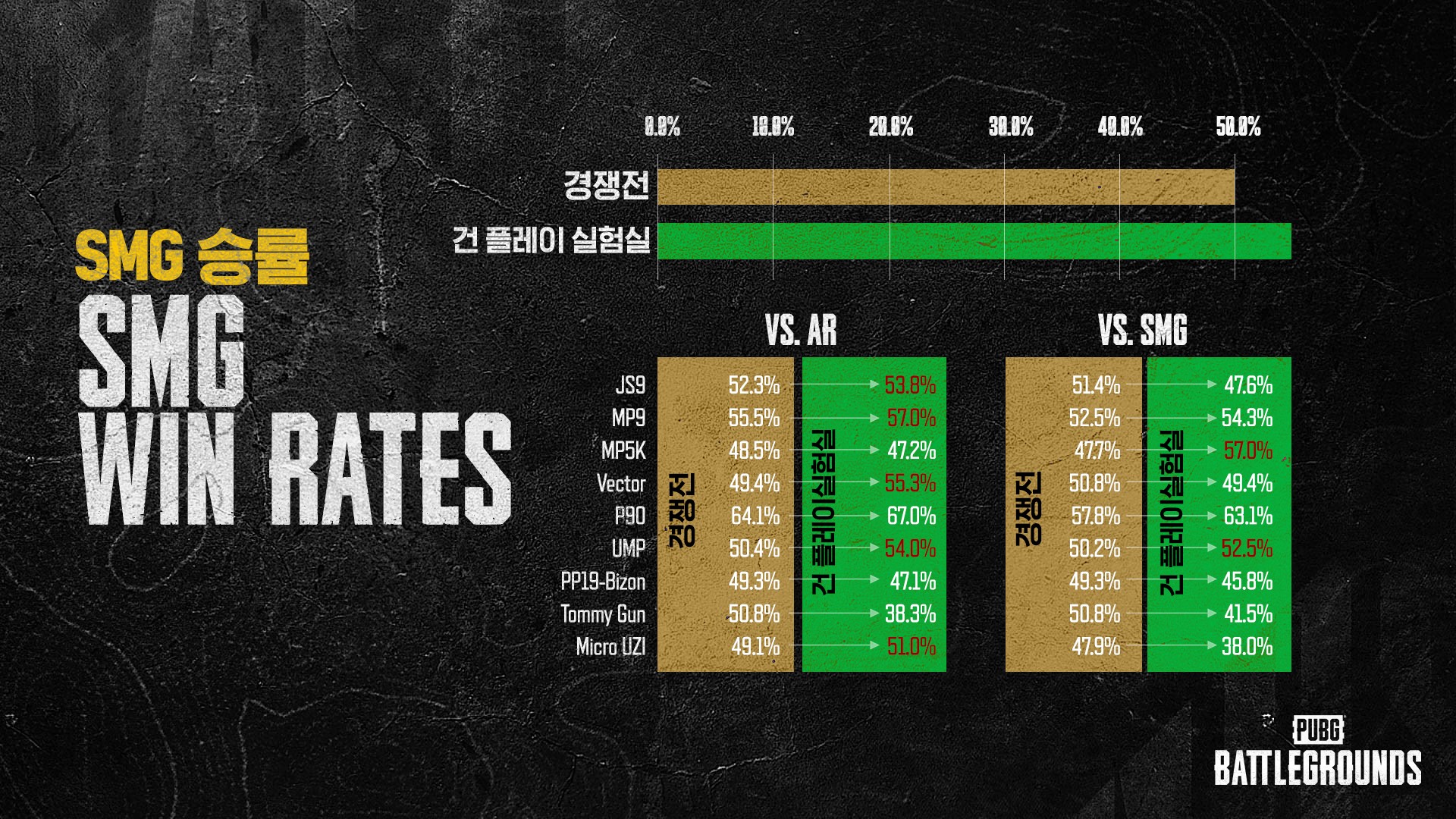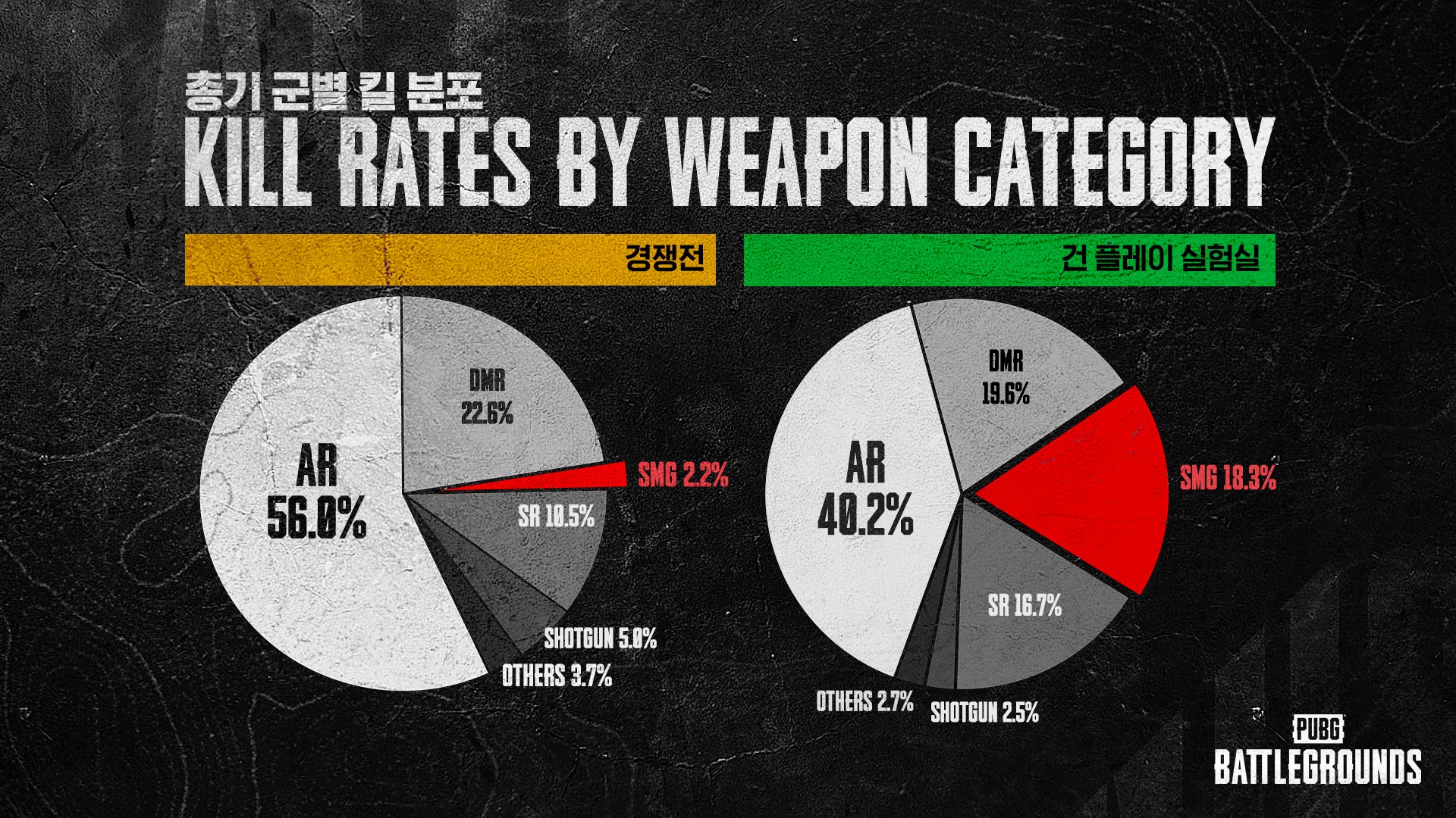 건 플레이 실험실에서는 SMG의 킬 점유율이 2.2%에서 18.3%로 상승하였음은 물론 승률 역시 50%~53%를 기록하였습니다.