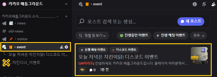 - [오늘 저녁은 치킨이닭! 디스코드 이벤트] 카테고리와 어울리지 않는 내용 또는 타인의 스크린샷 게시물은 이벤트 대상에서 제외됩니다.