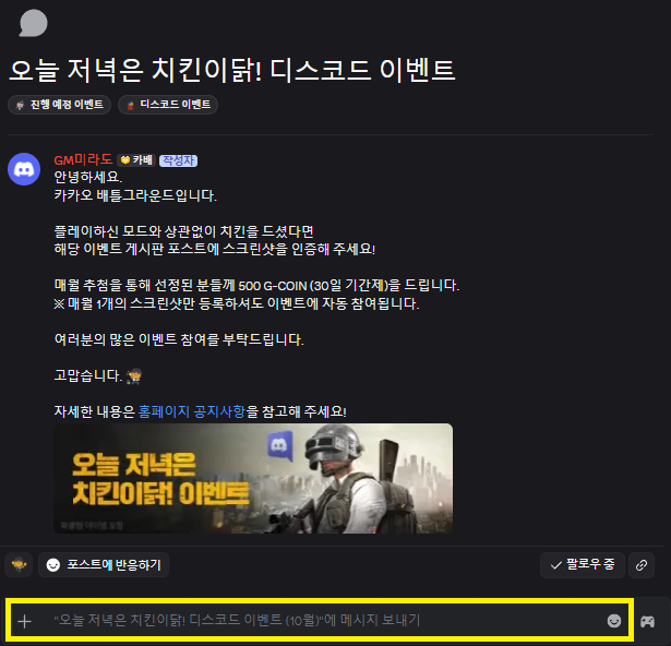 2. [event] 채널 하위의 [오늘 저녁은 치킨이닭! 디스코드 이벤트] 포스트에 스크린샷 등록!