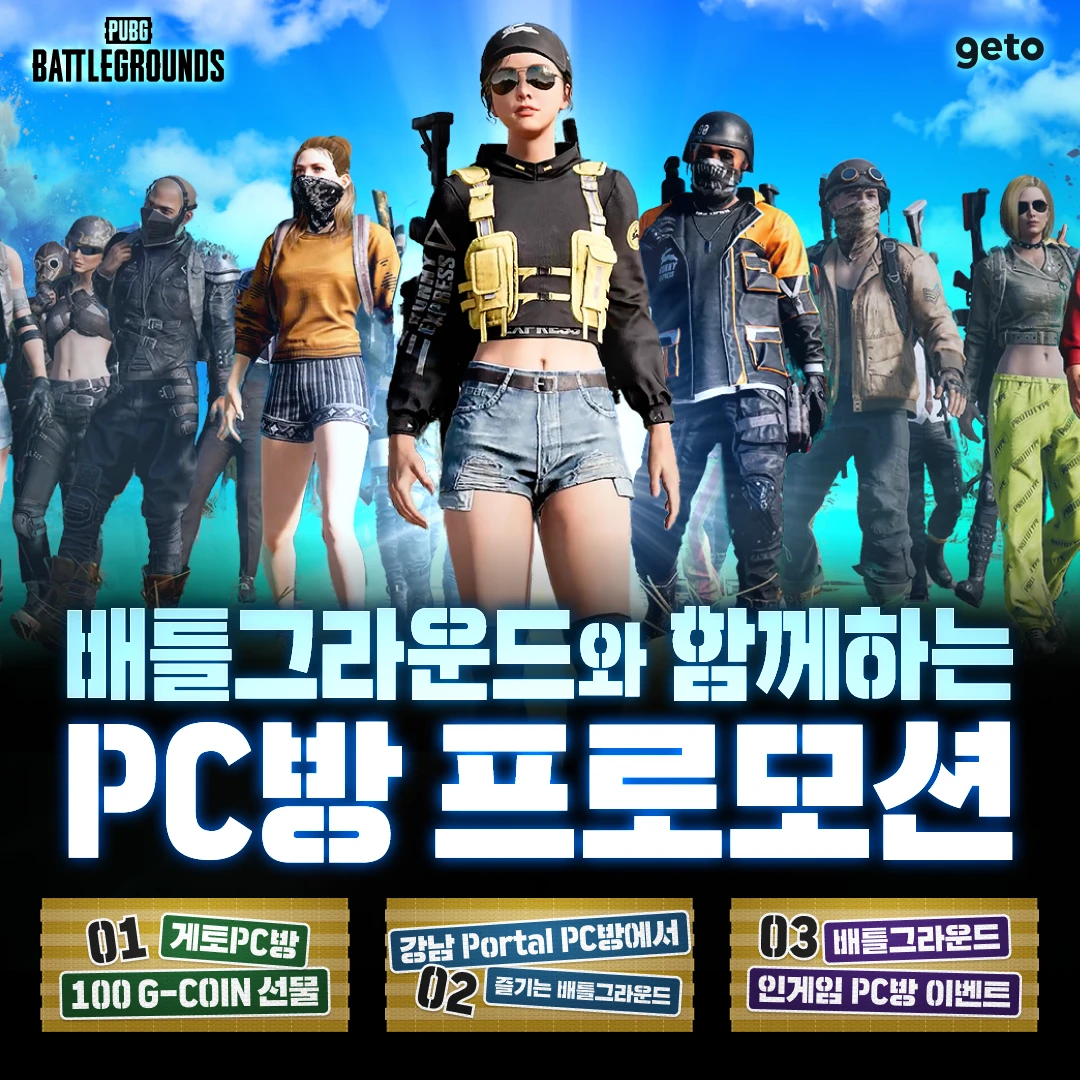 | 참여 방법 | 1. 게토PC방 중 이벤트 참여가 가능한 PC방 찾기 2. 스팀/카카오 배틀그라운드 1시간 플레이하기 3. 1시간 플레이 후 게임 종료 시 100 G-COIN(30일 기간제) 쿠폰 지급 |