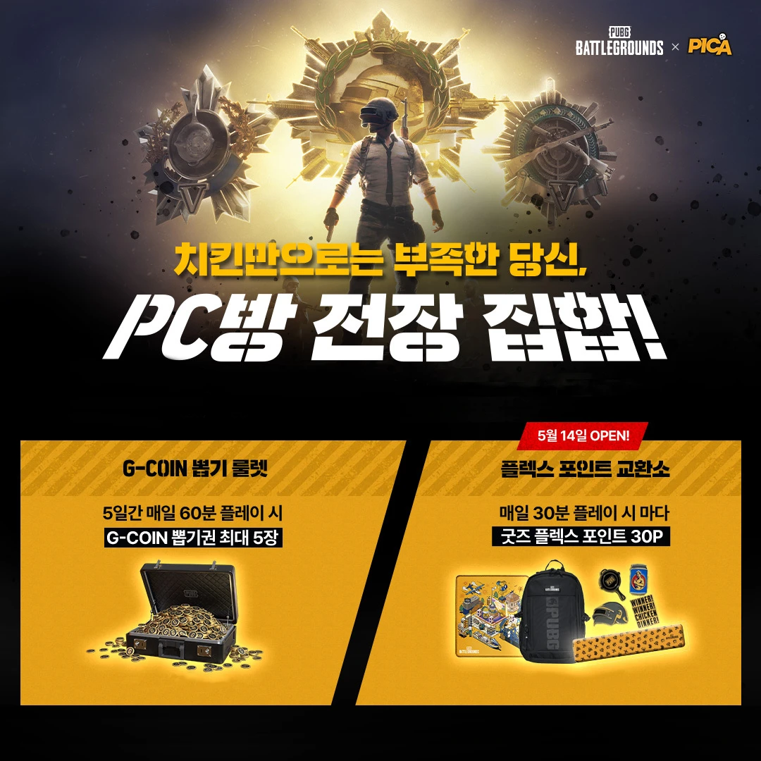 | 참여 방법 | 1. 피카플레이 회원으로 PC방 좌석 로그인하기 2. 누적 30분 플레이할 때마다 30 플렉스 포인트 획득(1일 최대 150 포인트(2시간 30분, 총 150분)) 3. 플렉스 포인트로 원하는 배틀그라운드 굿즈 응모하기 |