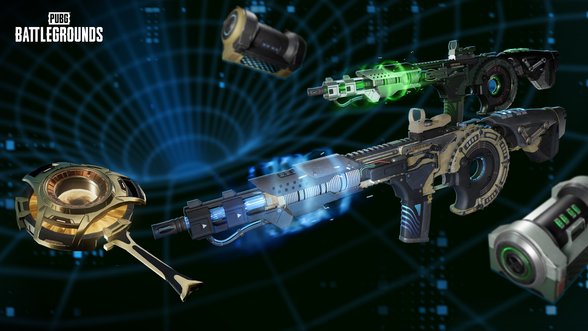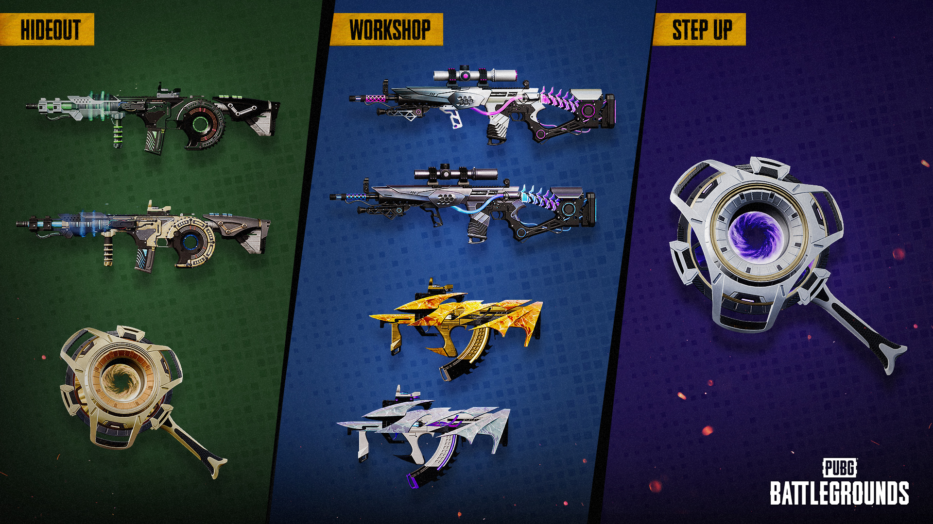 이번 스텝 업 팩에서는, 에란겔 맵을 기반으로 한 실험에서 구현된 강력한 에너지 현상을 시각화한 성장형 무기 스킨을 만나볼 수 있습니다.