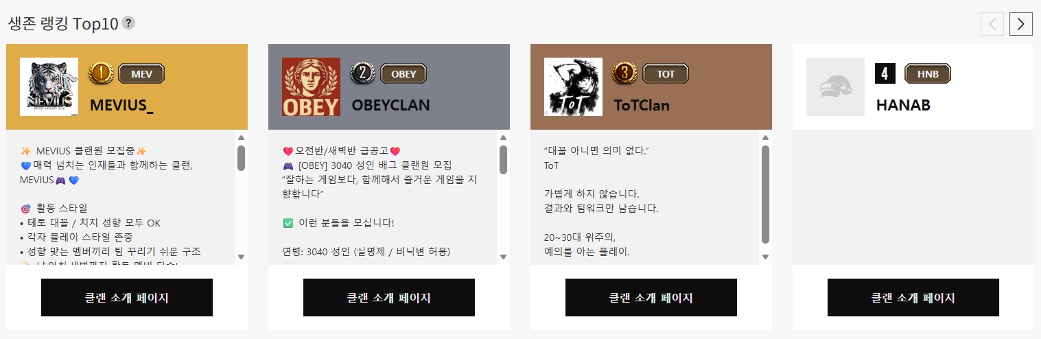 - 명예 보상 : 홈페이지 메인 화면 하단 '생존 랭킹 TOP 10' 영역에 클랜 노출