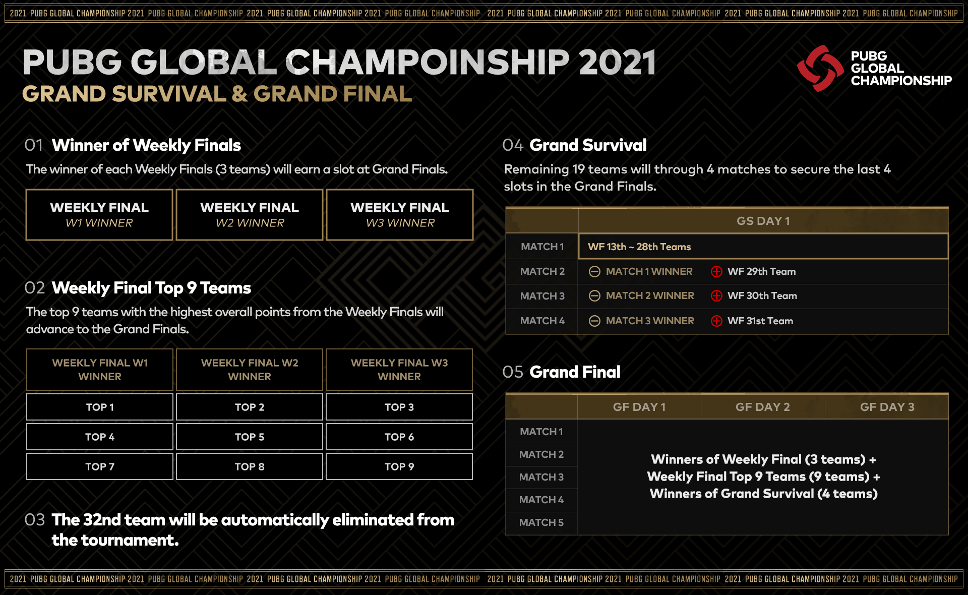 그랜드 파이널에서는 역경을 뚫고 탑 16팀에 도달한 팀들의 PGC 2021의 왕좌를 차지하기 위한 최후의 전투가 펼쳐집니다.