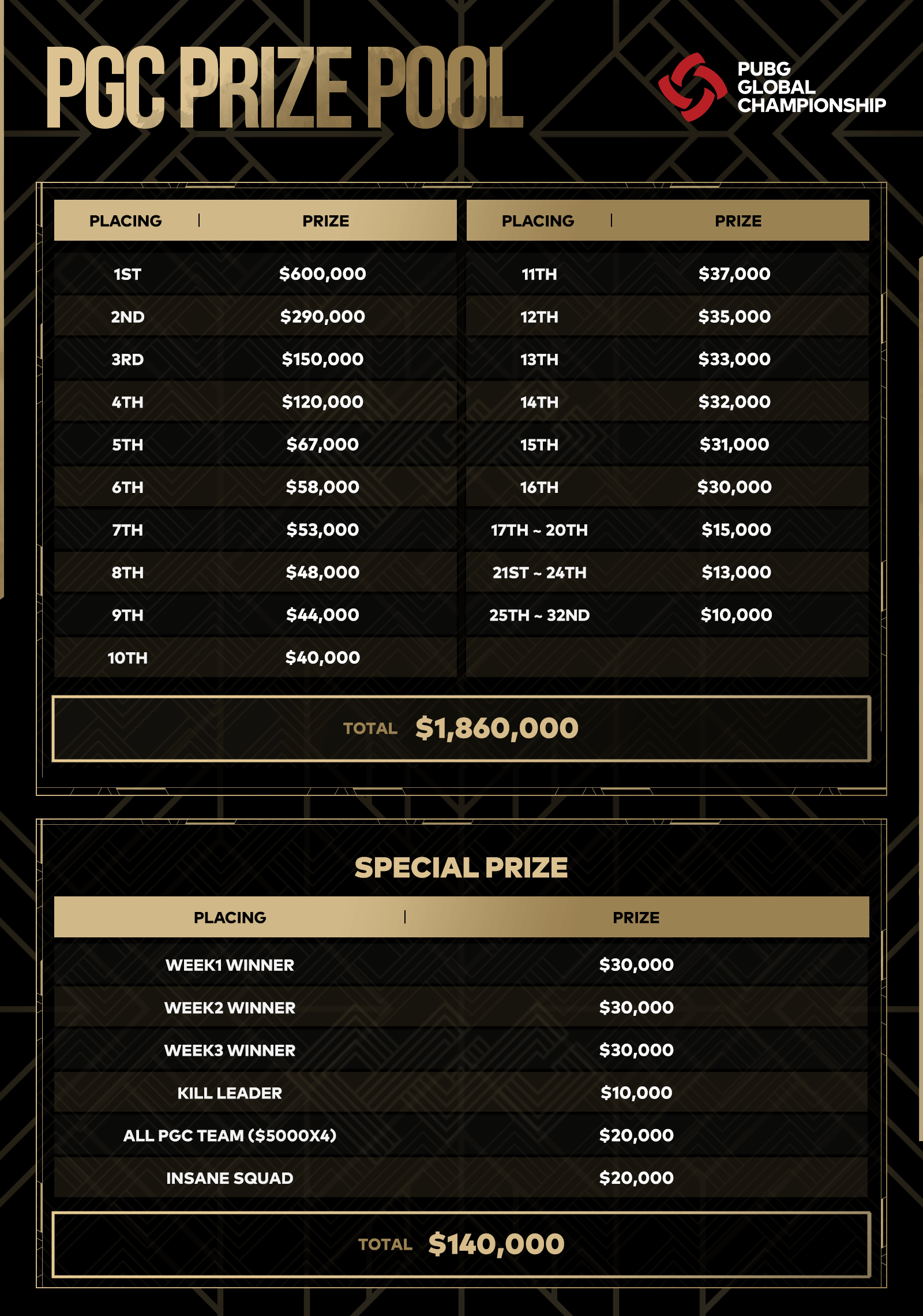 PGC 2021의 총상금은 2,000,000에 육박하며, 참가팀의 최종 순위에 따라 분배됩니다.