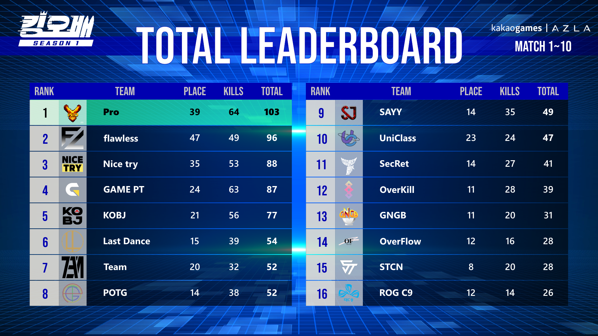 이번 시즌1은 박프로, DG98, 빠뽀, 도토리묵 등의 선수가 속한 'Pro' 팀이 최종 우승을 차지하였습니다!