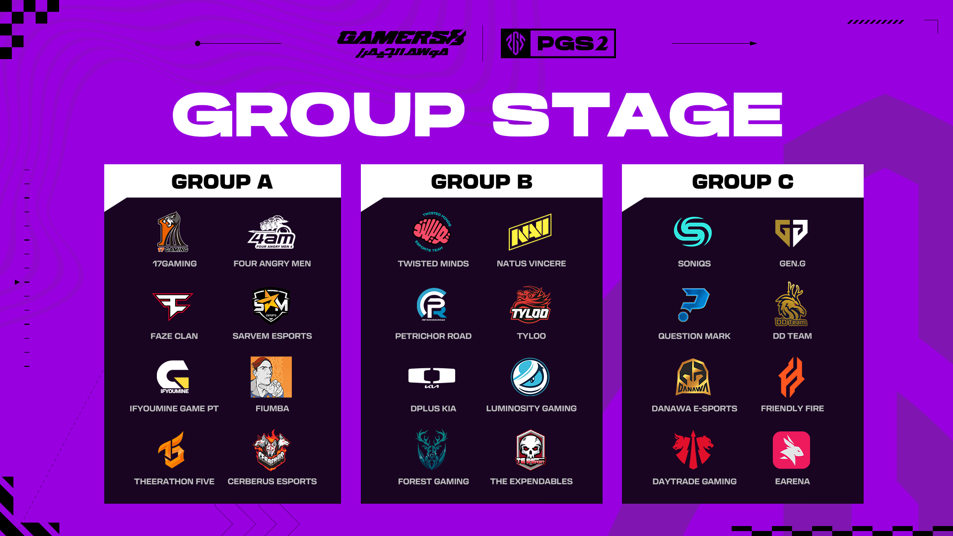 PGS 2 그룹 스테이지를 앞두고 총 3개 그룹(그룹 A,B,C)이 사전 편성되었습니다.