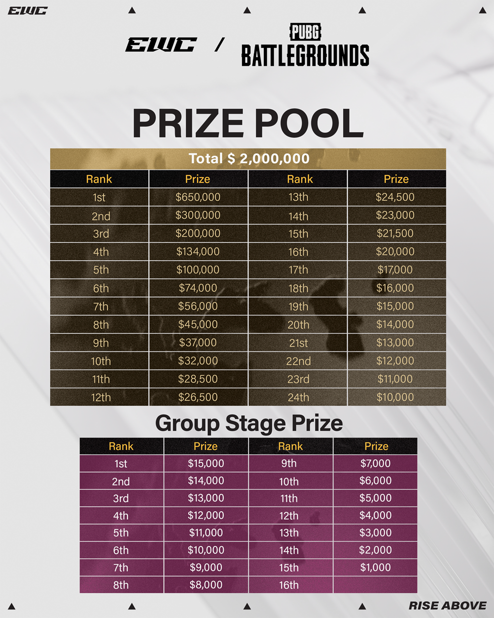 이스포츠 월드컵 배틀그라운드 부분의 총상금은 무려 $2,000,000이며, 팀들의 최종 성적에 따라 분배됩니다.
