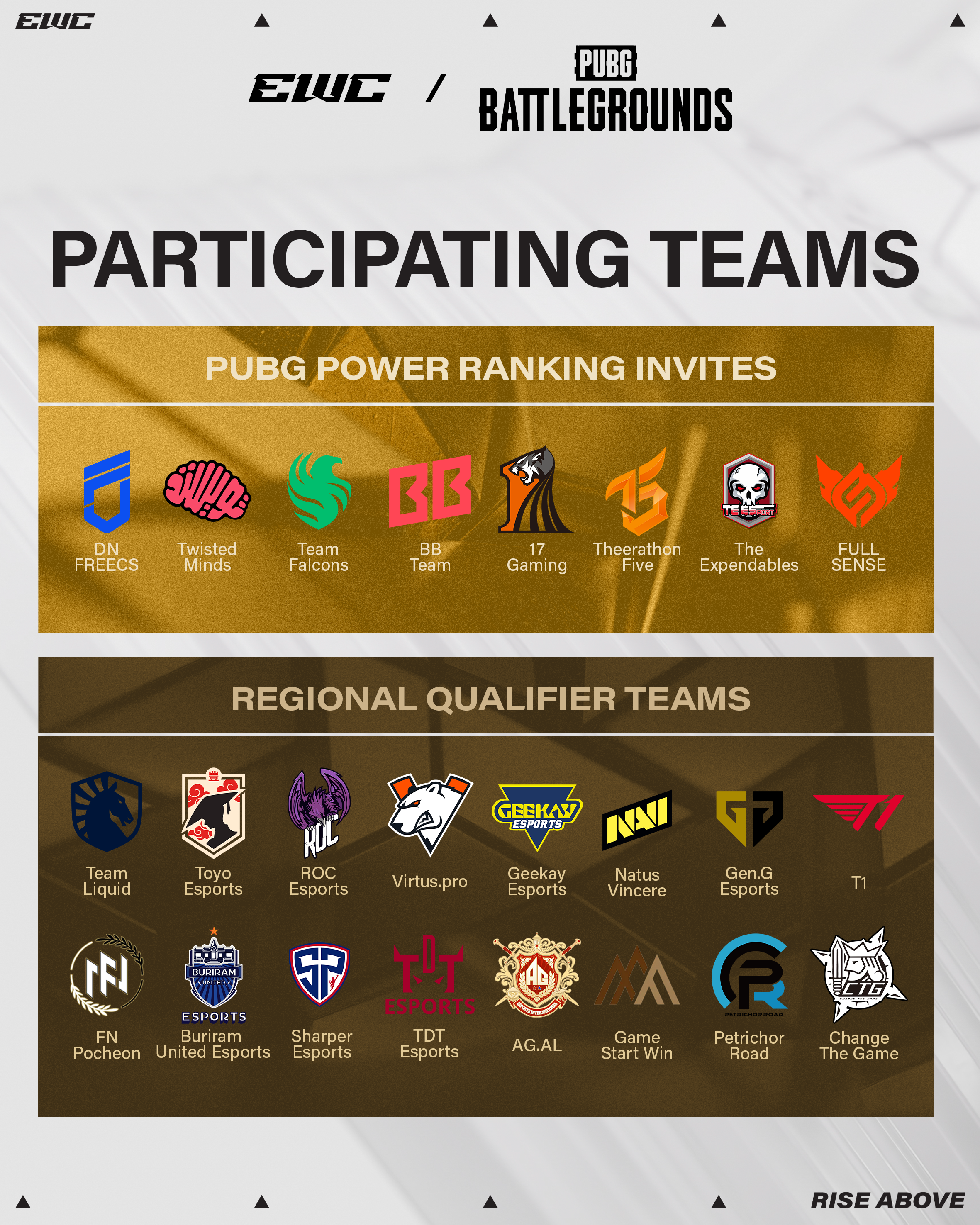 실력을 인정받은 펍지 파워 랭킹 부분 상위 8위에 해당하는 팀들은 즉시 EWC 본선 진출이 확정되었으며,