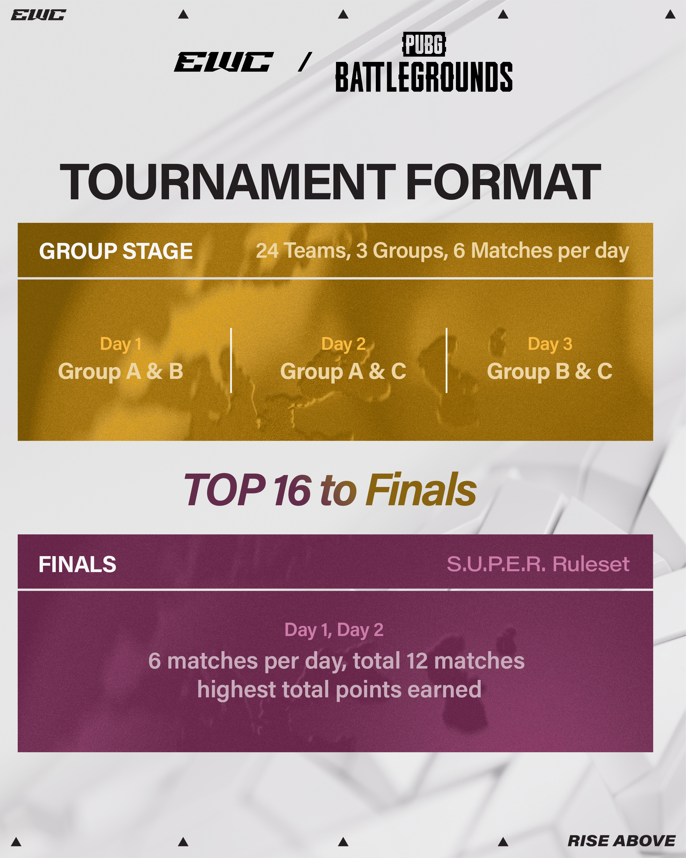 파이널에 진출한 16개 팀은 이틀간 총 12경기를 펼치며, 배틀그라운드 이스포츠의 전통 S.U.P.E.R. 포맷으로 진행됩니다.